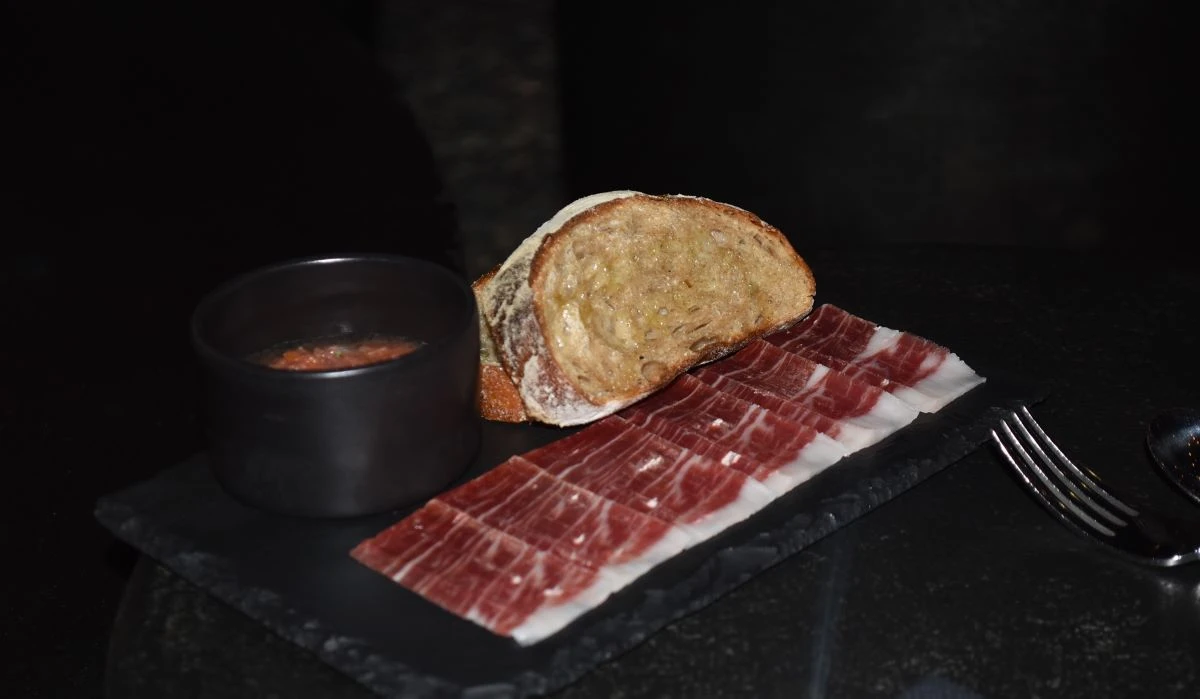 La cena comenzó estrenando el área del patio que fue remodelado; mientras nos despedía el atardecer con una preciosa puesta de sol, llegaron unas exquisitas y perfectamente cortadas láminas de jamón serrano Cinco Jotas, acompañadas de chicha, una bebida a base de fermento de maíz.