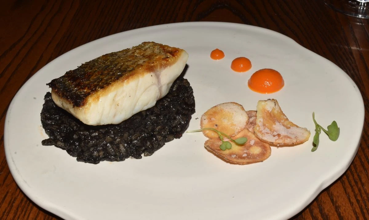 La primera proteína llegó en el tercer tiempo; el chef Luis Roger nos ofreció una lobina, acompañada de arroz con tinta de sepia, ganache de zanahoria y frituras de alcachofa de Jerusalén. La pesca se maridó también con el primer tinto de la cena, una edición limitada. La Bodega Montecillo es una de las vinícolas más antiguas de España.