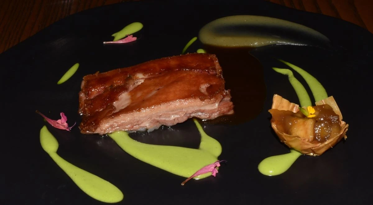 El cochinillo o lechón no podía faltar; este platillo es un emblema de la cocina española y se complementó con manzana Golden en distintas texturas. Para un plato tan importante en la culinaria de la "Madre Patria", las copas se llenaron con un vino Gran Reserva, edición limitada a 6,600 botellas, que a su vez nació como un homenaje al creador de la Bodega Montecillo, un tinto de etiqueta 22 Barricas.