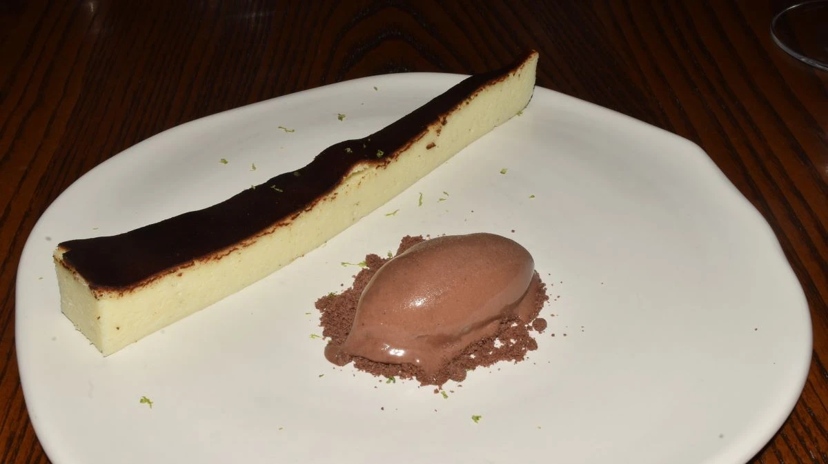 El final no perdió gracia, ni sabor, un cheesecake vasco, con muy buena presencia de queso, tierra de cacao y una quenelle de helado de cacao 66% mexicano, limón y helado de leche quemada, un esplendoroso cierre. Y como es costumbre, no sé la razón, un shot de tequila Reserva de la Familia Extra Añejo.