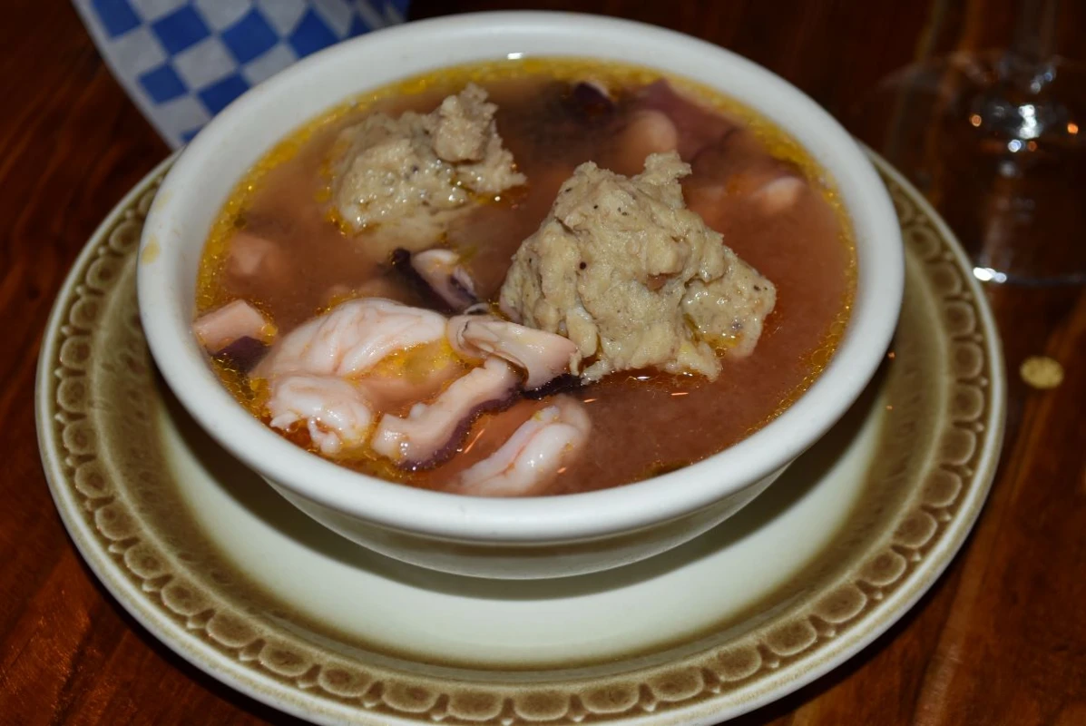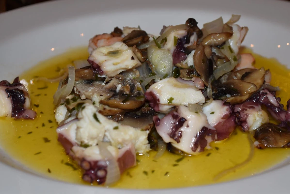 Combinación de camarón, pulpo y pescado con estragón, echalote y champiñones.