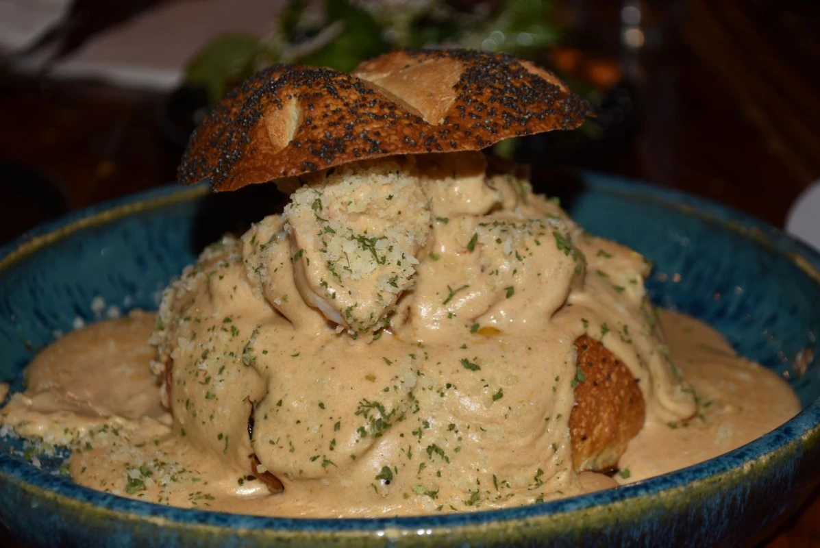 Cremoso de la Baja, pan hecho en casa, relleno de camarones a la plancha con trozos de tocino,