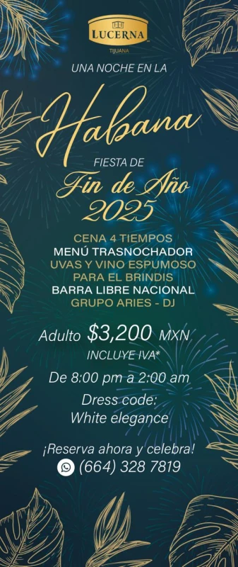 Este clásico en la ciudad, presentará una Fiesta de Fin de Año temática al estilo de los reyes del baile "Una noche en la Habana", la experiencia será completa, habrá una cena de 4 tiempos en la que se incluye carpaccio de langosta, ensalada de cogollos con queso azul, corazón de filete Rossini y un postre selva negra de maracuya. La bebida no hará falta con su barra libre nacional, Grupo Aries amenizando y DJ para complementar y llegada la madrugada, vino espumoso y uvas para brindar y recibir el año nuevo 2026.